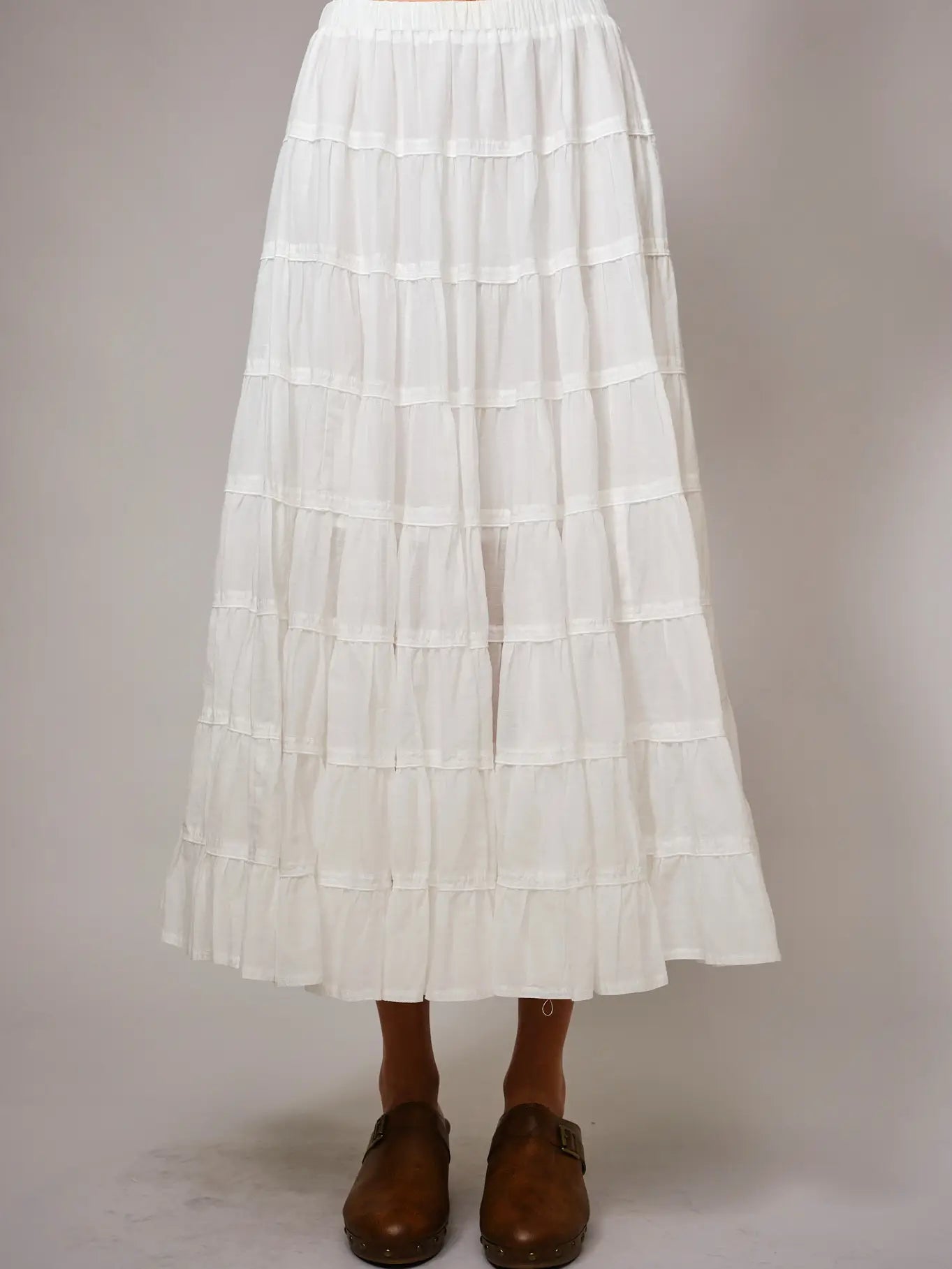 Effortlessly chic and seasonally versatile, the Aleah Tiered Cotton Blend A-Line Midi Skirt combines breathable comfort with refined silhouette. Crafted from a 78% cotton and 22% nylon blend, this lightweight piece features delicate tiered layers with gathered seams that create graceful movement and dimension. The semi-sheer finish adds an airy, sophisticated touch, while the elastic waistband ensures a relaxed yet polished fit. Perfect for warm weather styling, this midi skirt transitions seamlessly from casual daytime looks to evening occasions.