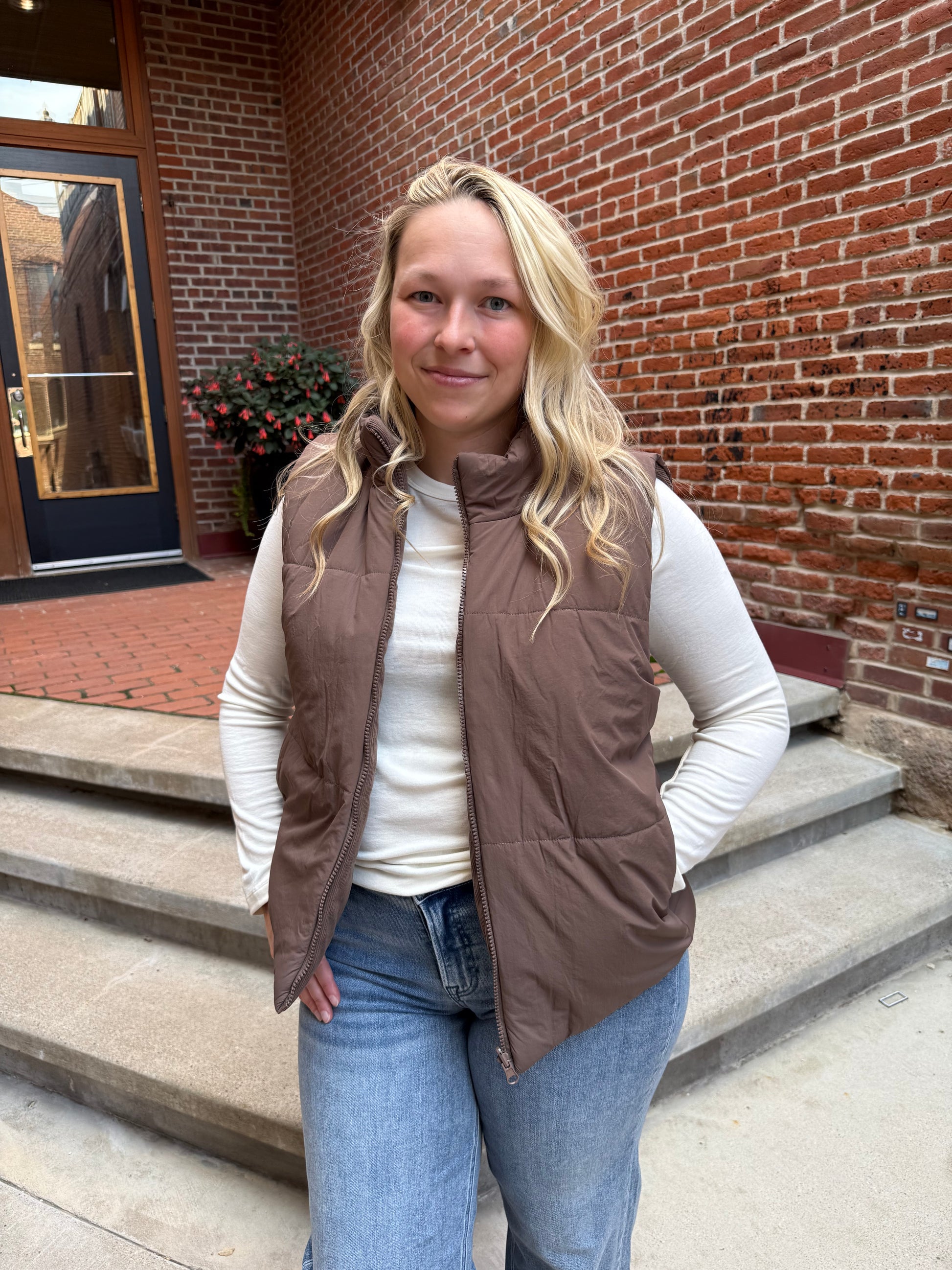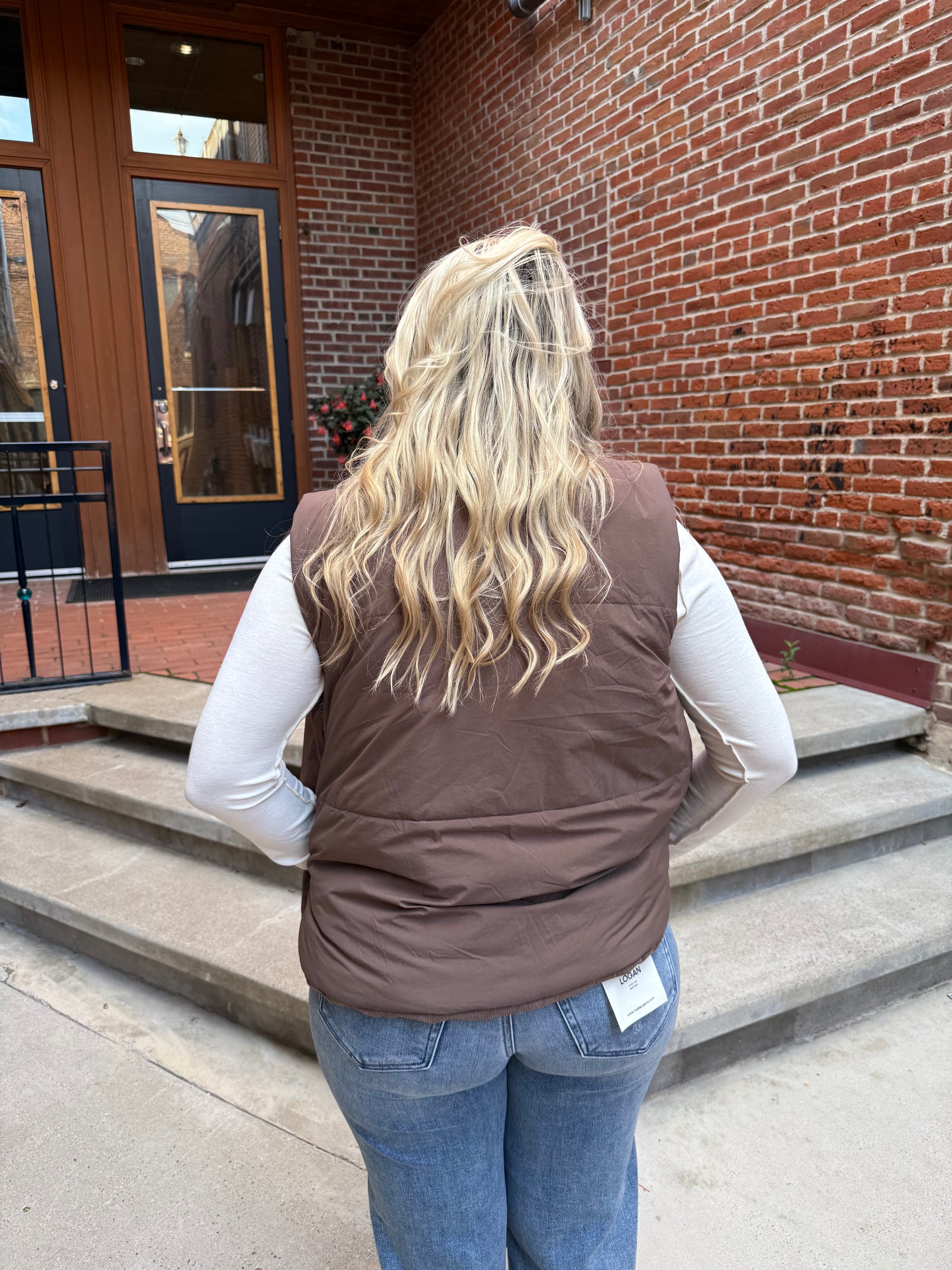 The Ava Reversible Vest in Brown combines versatile style with practical warmth. Featuring a cozy polar neck and zip-up front, this corduroy reversible puffer vest offers two distinct looks in one garment. Side pockets provide convenient storage while enhancing its functional design. Ideal for layering, it delivers both comfort and adaptable fashion for cooler days.