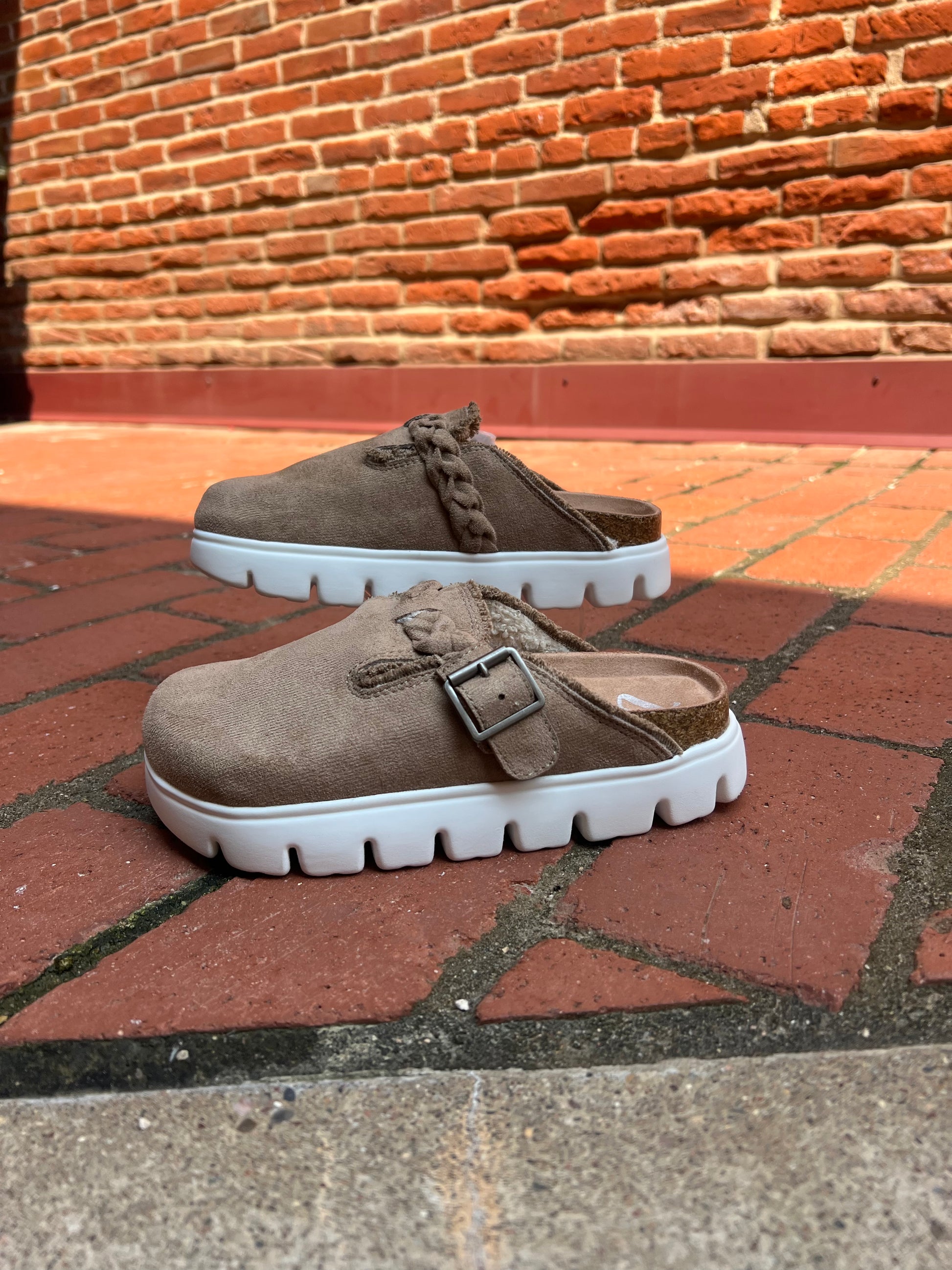 Cali Clogs in Taupe feature a refined design with a distinctive rope detail across the buckle, combining rustic charm with modern style. Crafted for comfort and durability, these clogs offer reliable support for all-day wear. Their versatile taupe color complements a wide range of outfits, making them a sophisticated choice for both casual and elevated looks.