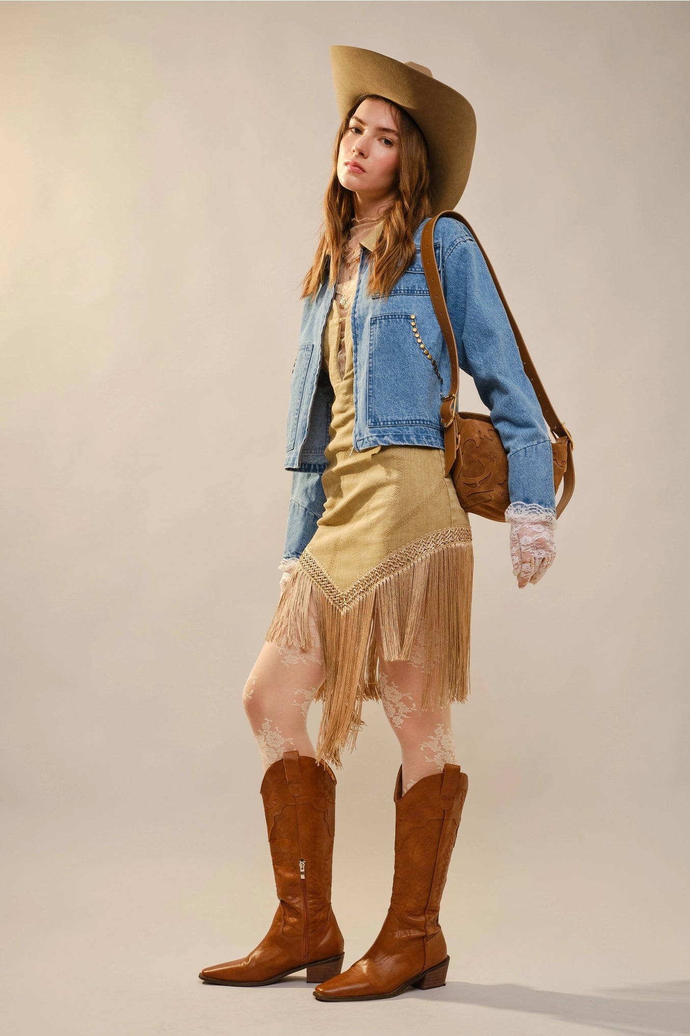 Embrace effortless western charm with the Corinne Stud Trimmed Cropped Denim Jacket. This versatile piece features a striking contrast collar and antique gold stud accents along the front pockets, delivering authentic cowboy-inspired style. The relaxed silhouette and front flap pockets make layering seamless, whether you're dressing up or down. Crafted from a durable cotton-polyester blend, this cropped jacket transitions beautifully from season to season. Perfect for adding character to any wardrobe.