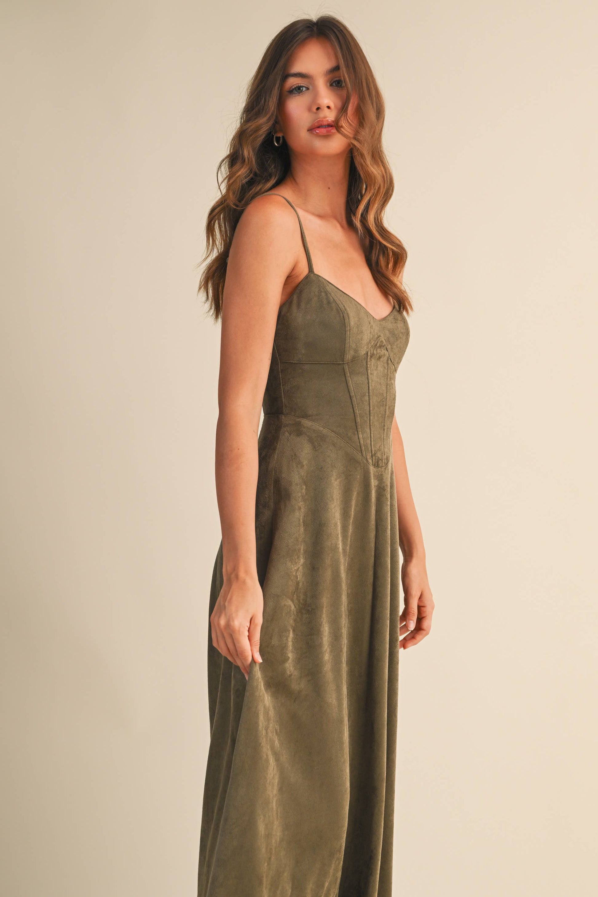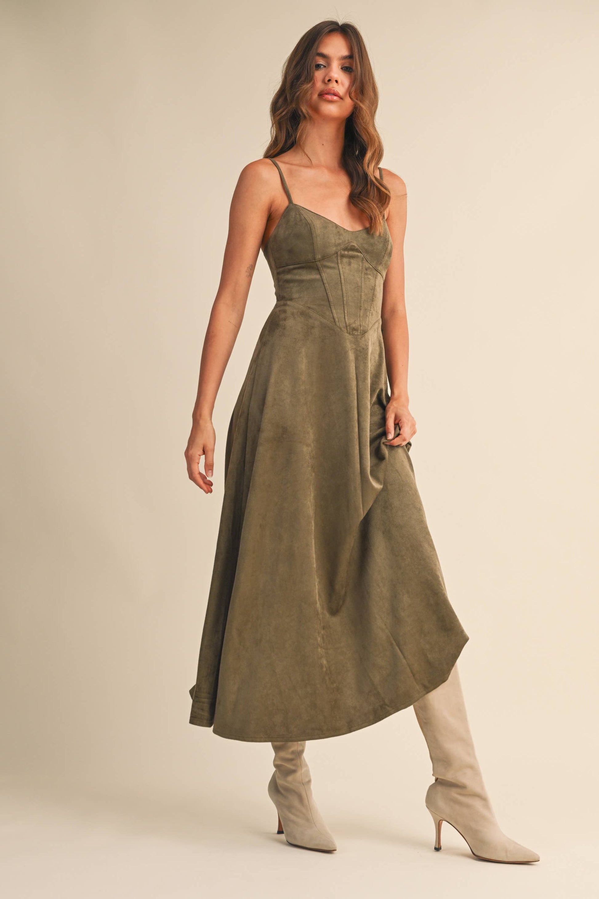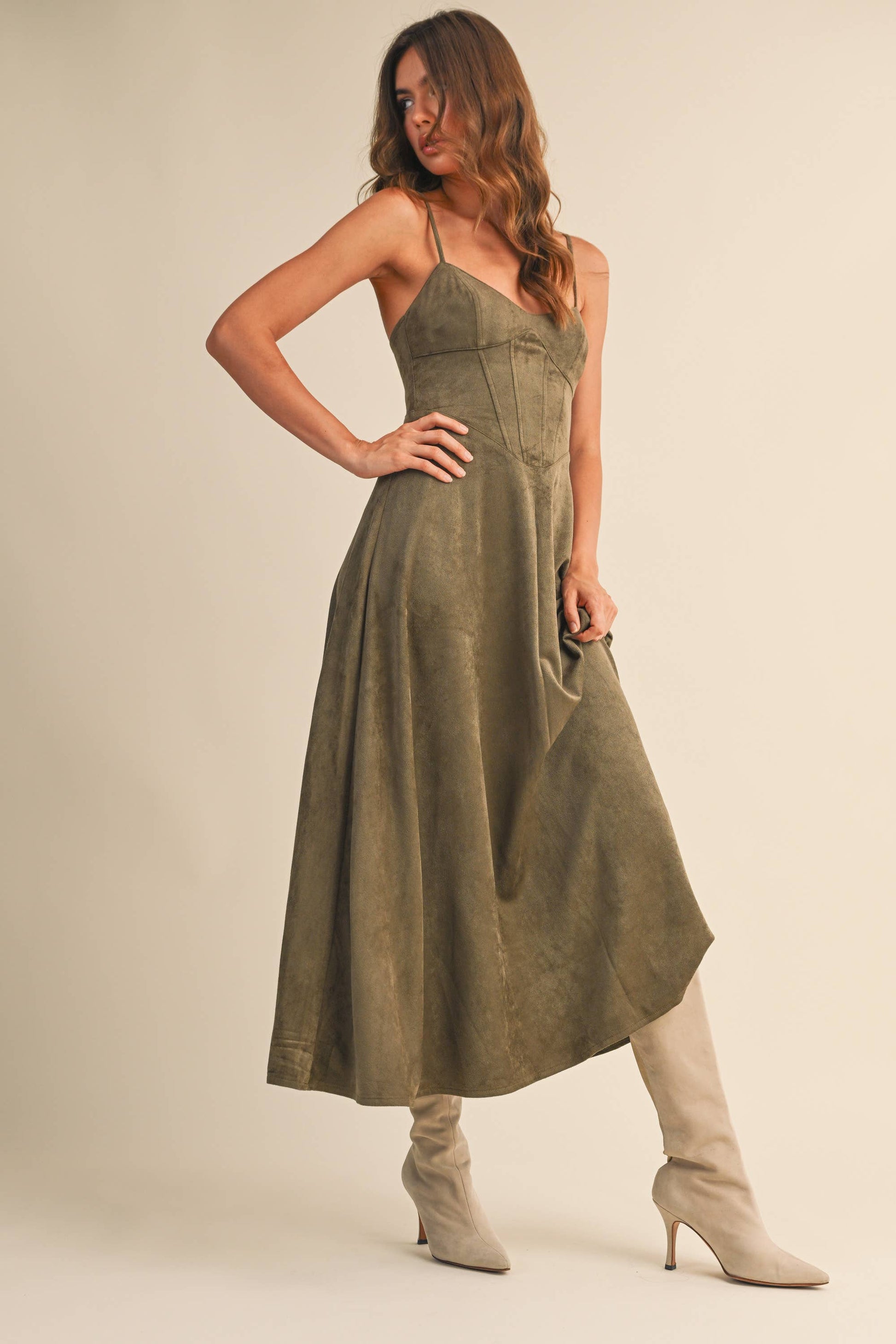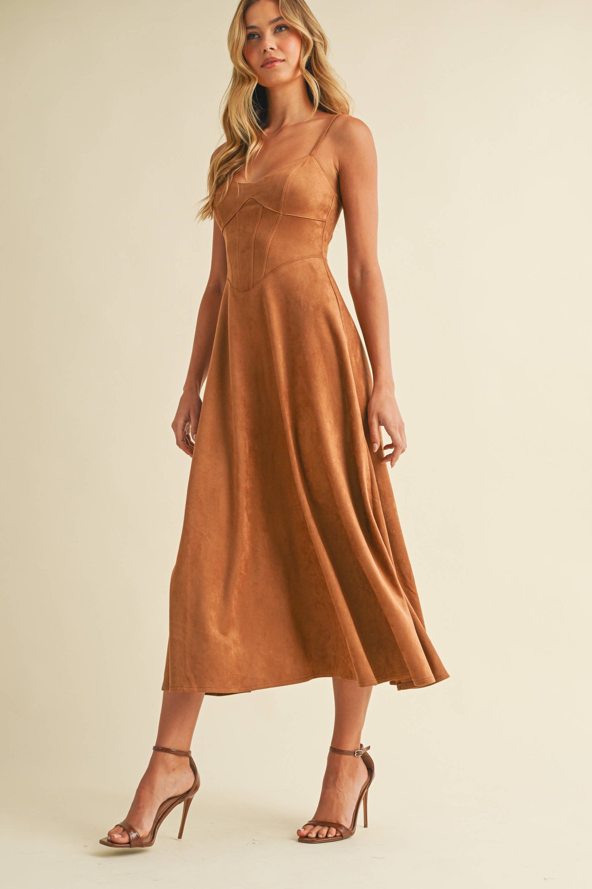 Emma Suede Corset Midi Dress in Camel