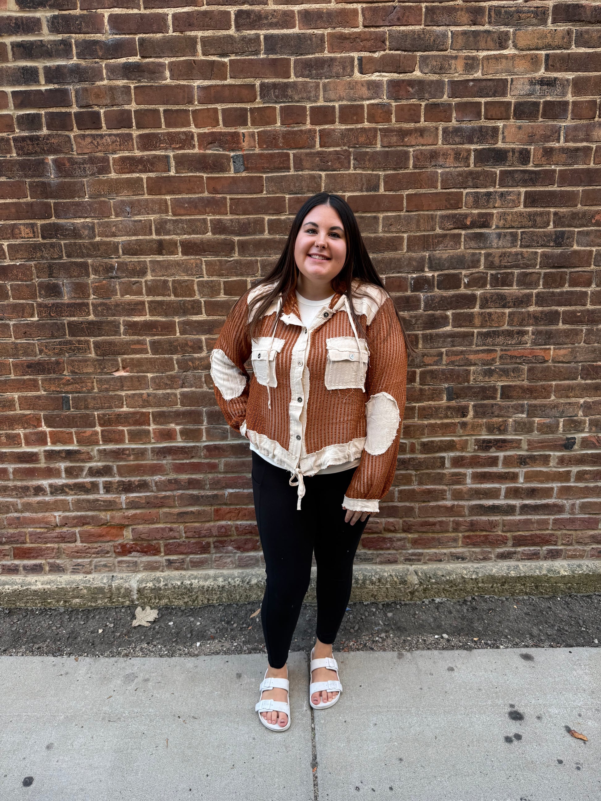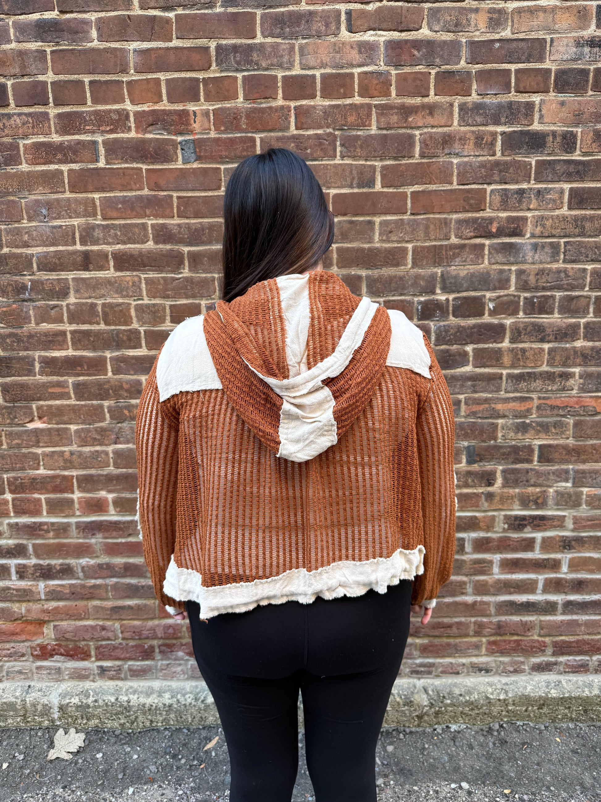 This open-knit button-down hoodie top combines a sheer, textured woven fabric with a relaxed silhouette, featuring frayed edges for a subtle distressed effect. Practical details include a chest pocket and elbow patches, adding both style and durability. With a length of 22.5" and a bust measurement of 23", it pairs perfectly with matching bottoms for a coordinated look. Ideal for layering, this piece balances casual comfort with a distinctive, fashion-forward design.