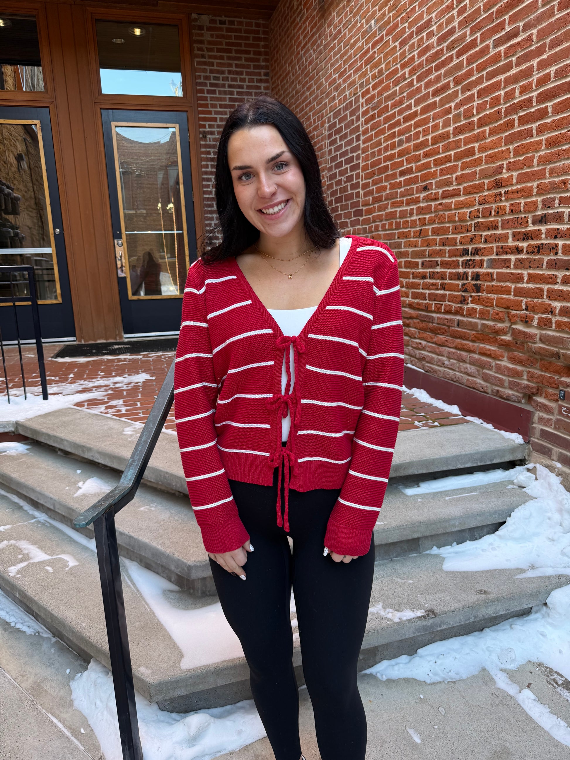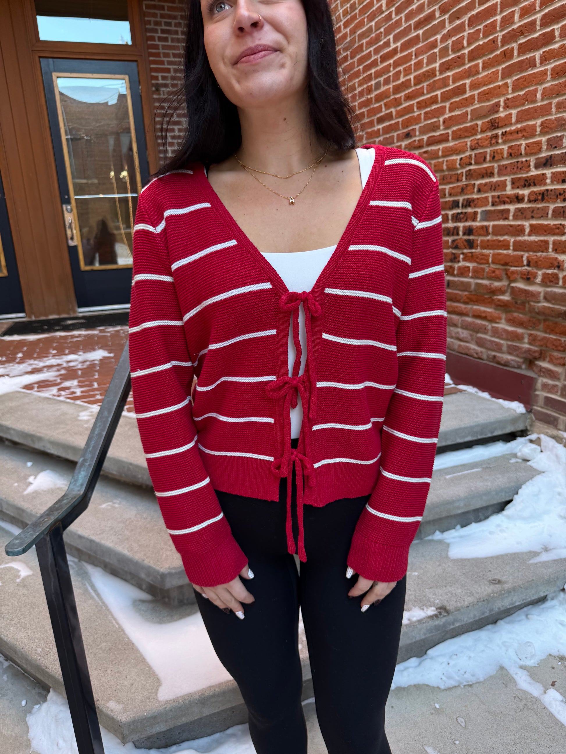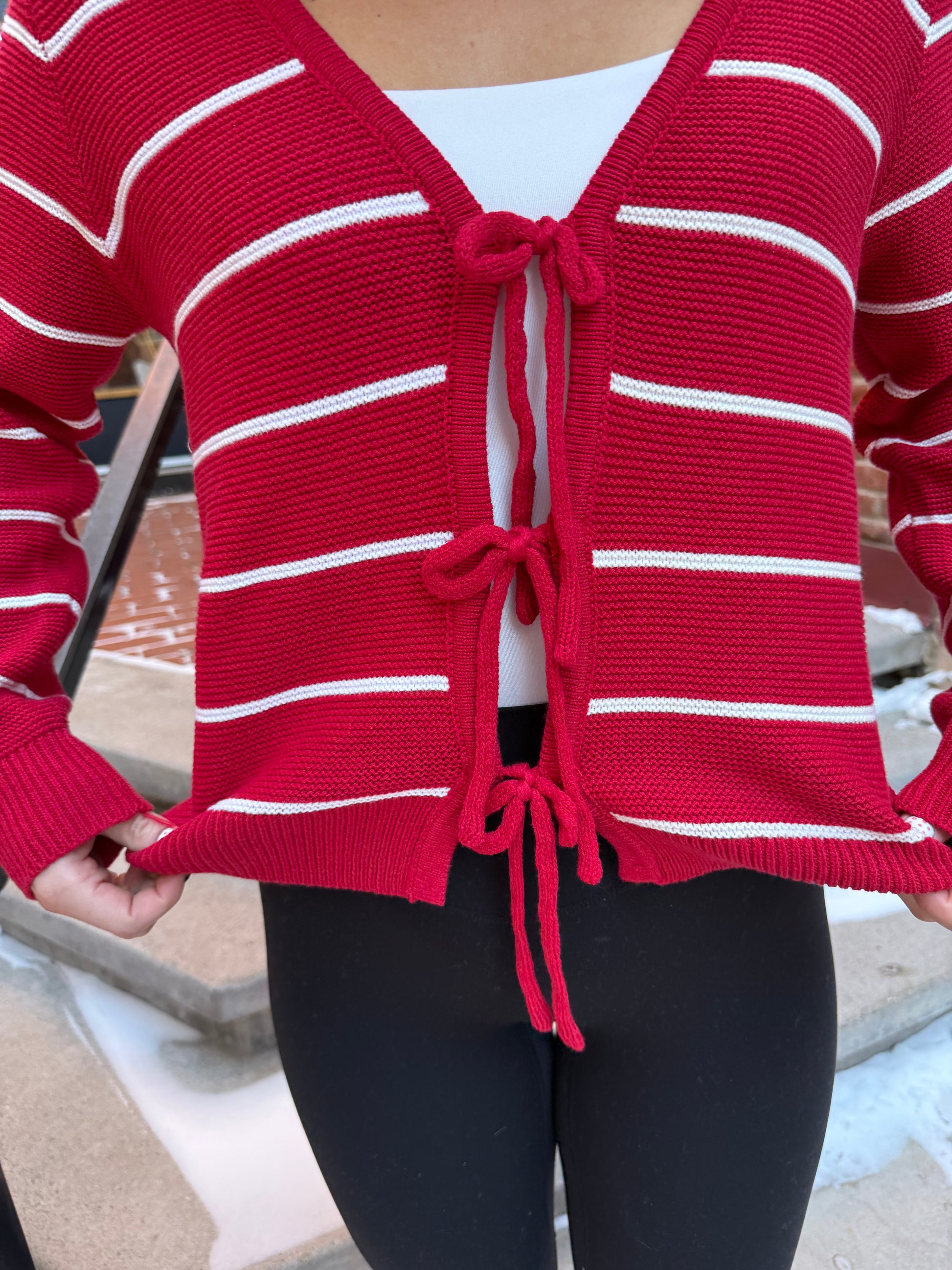 Elevate your wardrobe with this sophisticated V-neck tie cardigan, featuring a charming bow tie detail at the front and refined long sleeves. The classic striped pattern adds visual interest while maintaining timeless appeal. Perfect for layering over dresses or pairing with tailored trousers, this piece transitions seamlessly from office to evening occasions. The structured knit construction ensures durability and shape retention, making it a reliable investment for any style-conscious wardrobe.