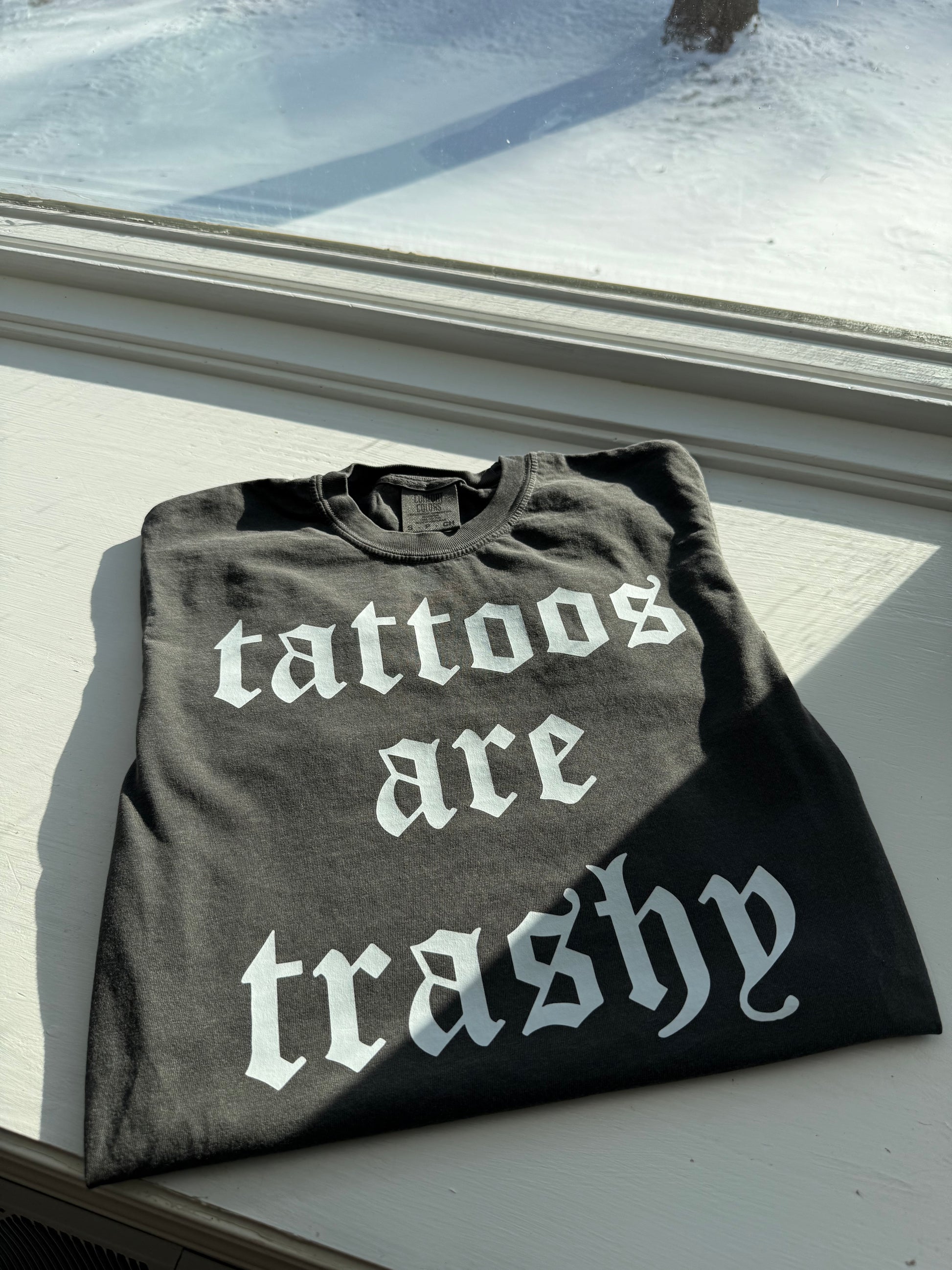 Our Tattoos are Trashy Graphic Tee is constructed from Comfort Colors fabric, ensuring superior softness and durability. The bold, all-capital lettering prominently displays the funny phrase "tattoos are trashy." This tee combines comfort with a playful design, offering a versatile addition to casual wardrobes. Select few are on hand with others made to order.